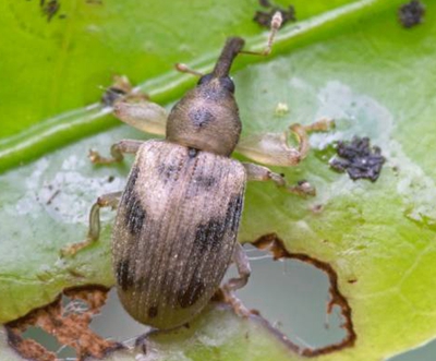 茶芽粗腿象(Ochyromera quadrimaculata Voss),又名四斑粗腿象、茶四斑小象甲,屬鞘翅目象甲科。主要為害茶樹、油茶等。分布于福建、浙江、湖南、貴州、江西等地。以成蟲咬食葉片成許多小孔洞,在局部茶區(qū)零星發(fā)生。