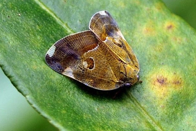 成蟲:體長為6.5?8mm,翅展為19?23mm。體褐色至深褐色,有的個體很淺,近黃褐色,中胸背板色最深,近黑褐色,足的顏色稍淺。額中脊長而明顯,側(cè)脊很短,前胸背板具中脊,兩邊刻點明顯;中胸背板長,具縱脊3條,中脊長而直,側(cè)脊前半端分叉,二內(nèi)叉內(nèi)斜在端部互相靠近,外叉短,基部稍斷開。前翅深褐色,后緣色稍淺,前緣外方1/3處有三角形大透明斑,近中部有1正圓形透明斑,此斑的內(nèi)方還有1暗褐色小圓斑;外緣有1大2小不規(guī)則形的透明斑,后斑較小,斑紋常散成多個;沿外緣還有1 列很小的透明小斑點;翅面上散布有白色蠟粉。后翅黑褐色半透明,脈紋近黑色,前緣基部色稍淺。后足脛節(jié)外側(cè)具刺2個。