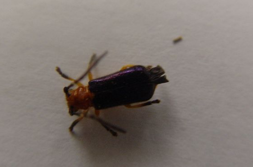 成蟲(chóng):體長(zhǎng)為9?11mm。頭、前胸背板及小盾片絳紅色,前胸背板中部有1疣突。觸角柄節(jié)絳紅色,第三、四節(jié)基部橙黃色,其余皆為黑色。復(fù)眼黑色。鞘翅藍(lán)色帶紫色光澤,散生粗刻點(diǎn)。腹面橙黃色。各足跗節(jié)及脛節(jié)端部1/3?2/3黑色,其余橙黃色。全體多毛。