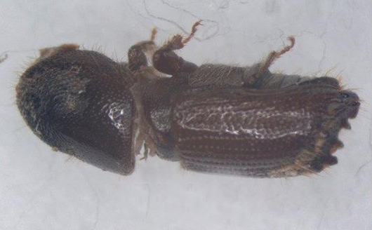 對(duì)粒材小蠹[Xyleborus perforans(Wollaston)]屬鞘翅目小蠹科齒小蠹亞科材小蠹屬。主要分布于馬達(dá)加斯加、印度、斯里蘭卡、菲律賓、印度尼西亞、北美、巴西及我國(guó)廣西(龍勝)、云南(西雙版納)和海南。其寄主范圍廣,包括橡膠、鐵刀木、巴西木等。